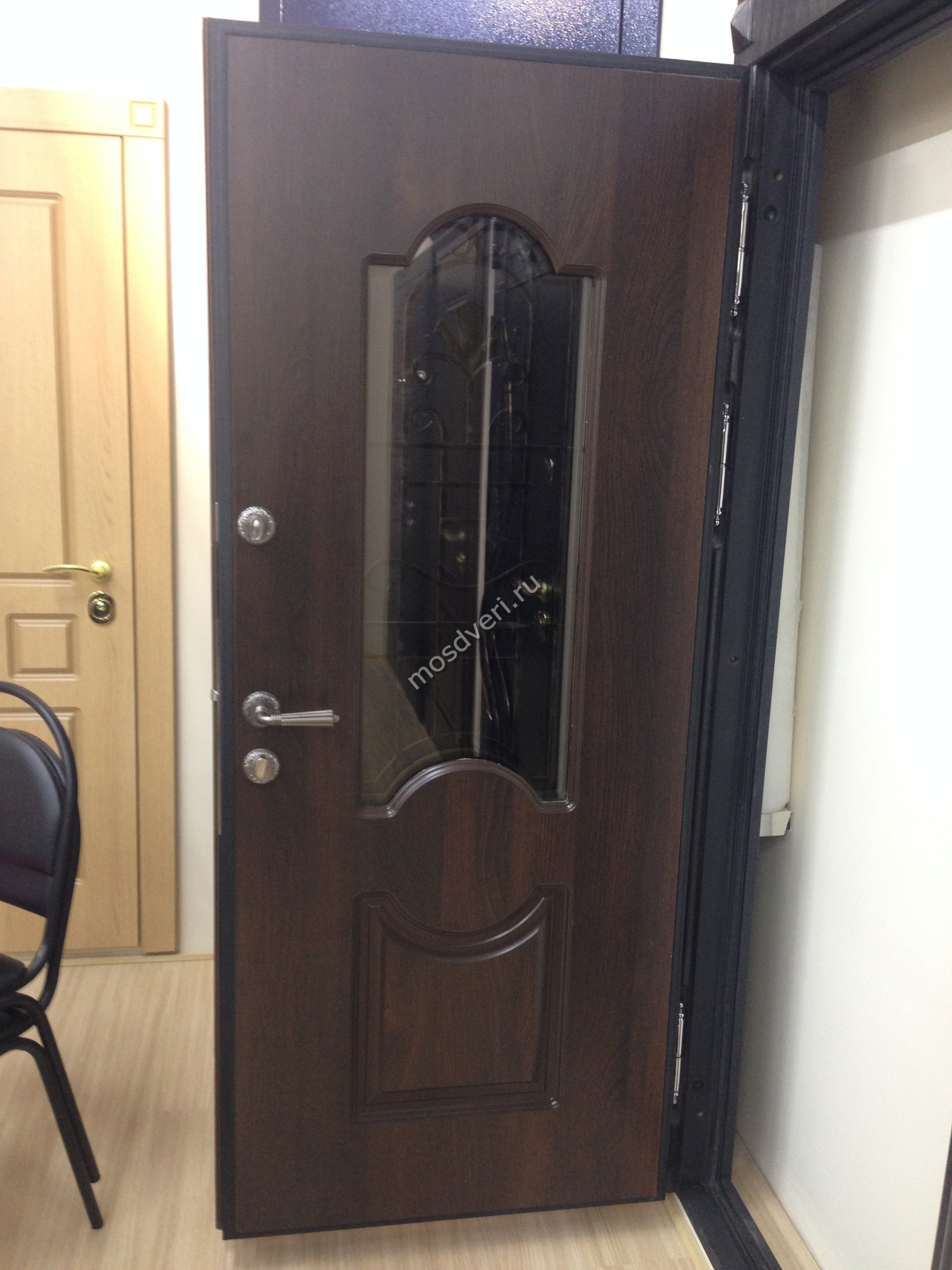 Заказала входную дверь черный антик снаружи. Внутренняя сторона с зеркалом — очень удобно! Товар привезли через 2 недели. Сервис быстрый, честно не ожидала. Толщина металла хорошая, звукоизоляция тоже. В магазин обращусь еще когда буду менять дверь на даче.